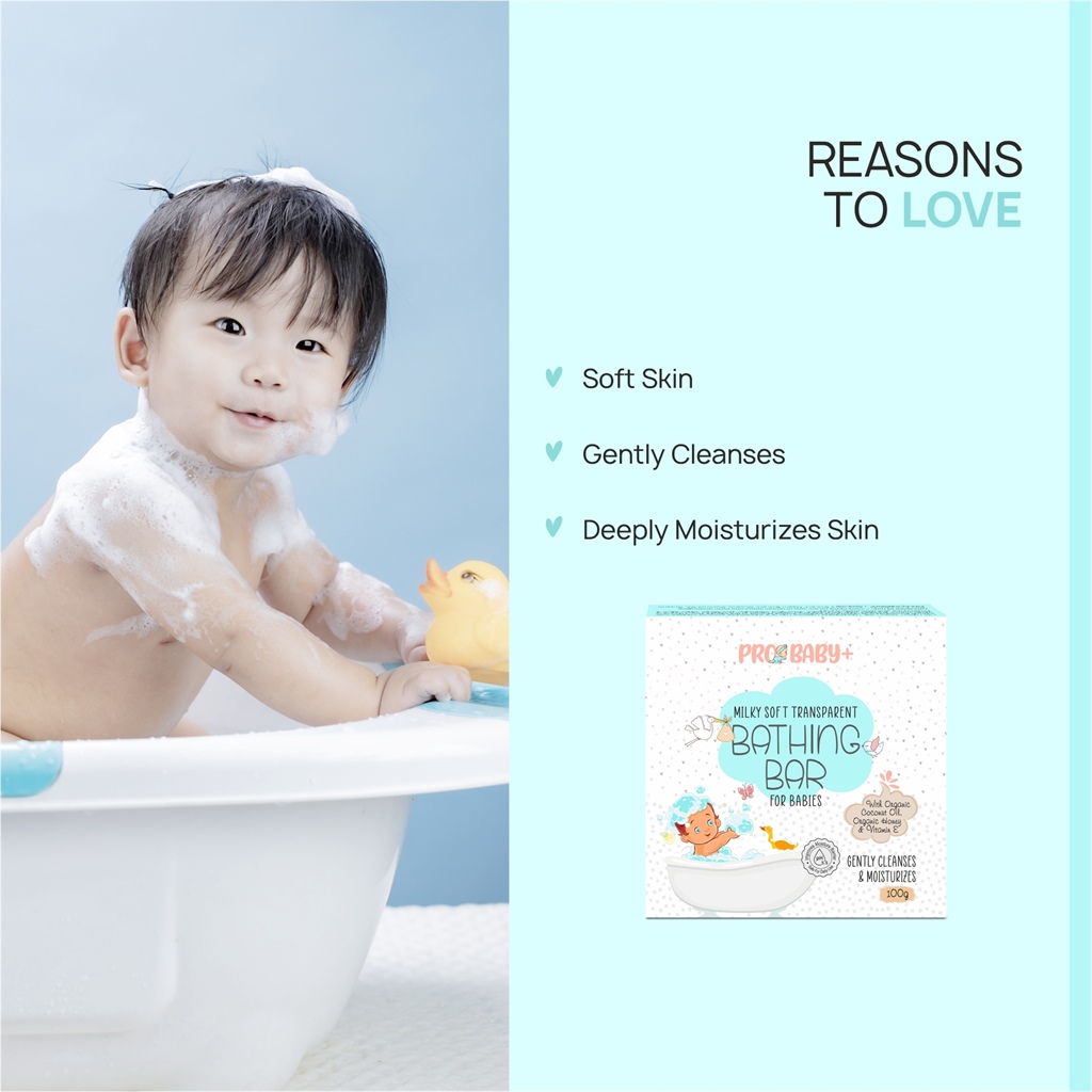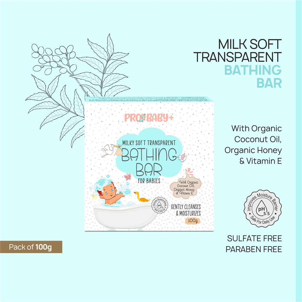 Pro Baby+ Milky Soft Transparent Bathing Bar is a handmade product created with natural emollients that restore the healthy supple texture of the babies skin. Devoid of harsh chemical based cleansers, this soap cleans gently and is ideal for daily use. It is soothing for the skin that is irritated, itchy and inflamed, and when used daily it protects the skin from these issues.