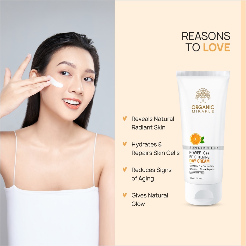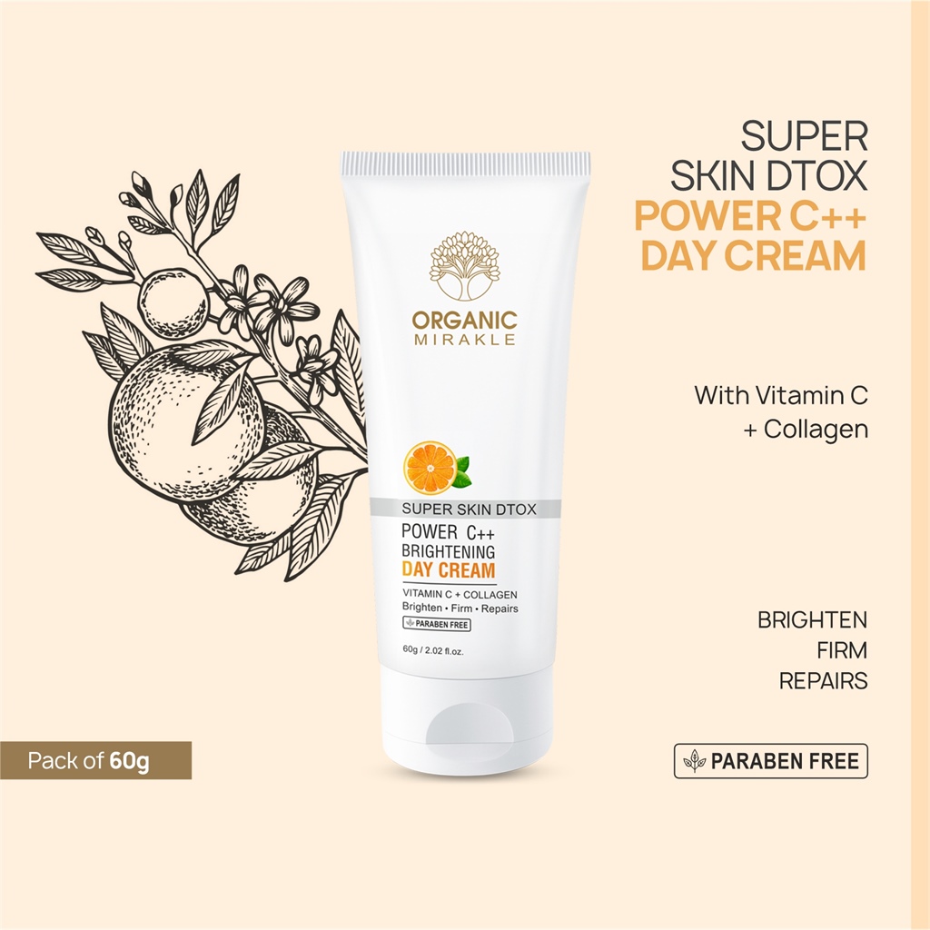 This powerhouse brightens your skin naturally and reduces signs of aging. Super DTox Power C++ Brightening Day Cream with Vitamin C and Collagen is lightweight, provides hydration and gives your face a natural glow. Enriched with niacinamide and antioxidants, it fights photoaging, freeradical damage, and repairs skin cells to reveal healthy and radiant skin. Suitable for all skin types, Super D Tox Power C ++ Brightening Day Cream has no harmful chemicals and is free of parabens, toxins and mineral oils.
