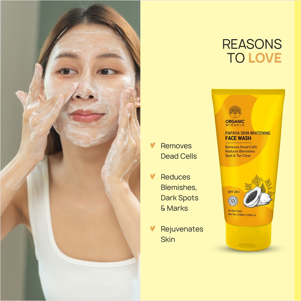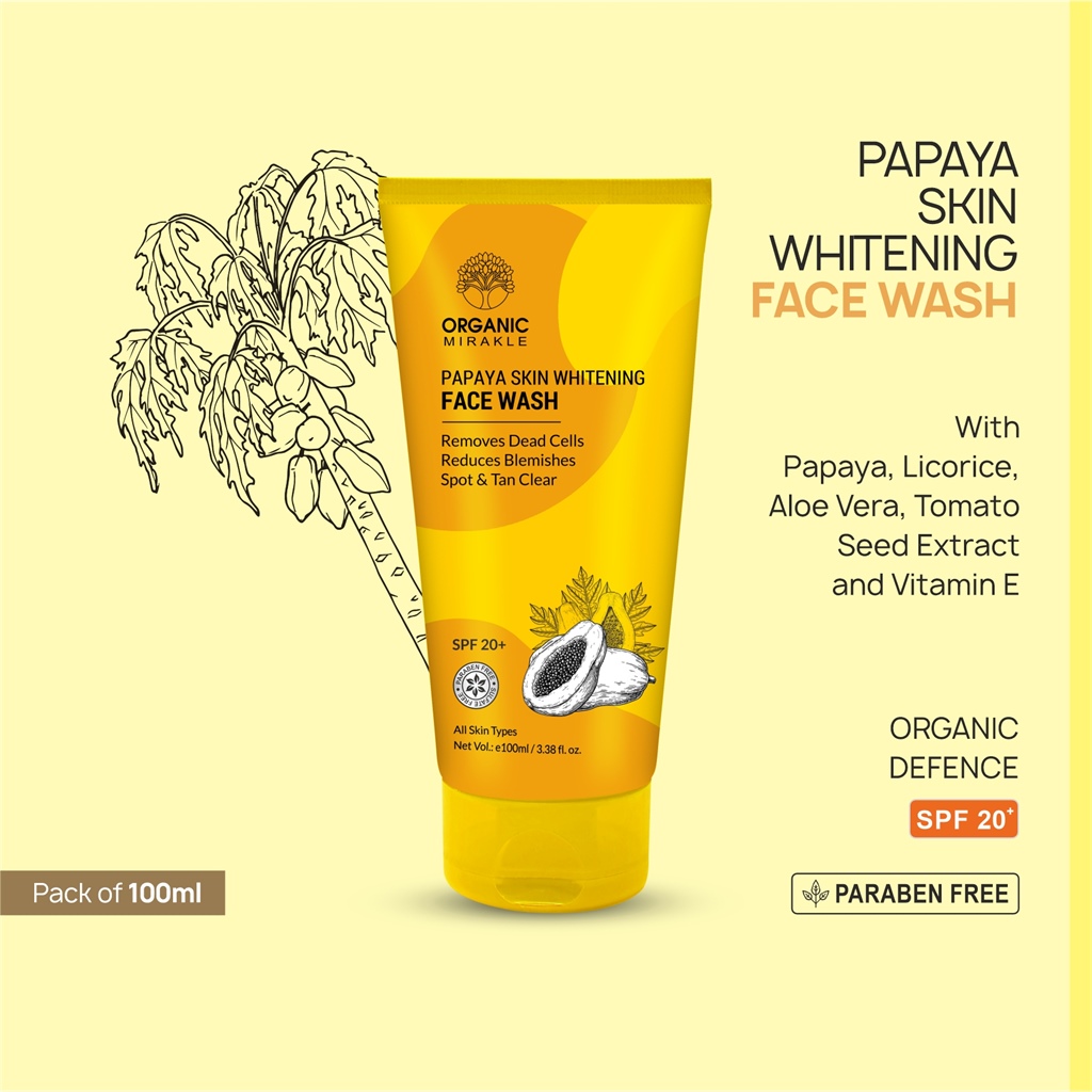 Organic Mirakle Papaya Skin Whitening Face Wash is an extra-gentle facial cleanser infused with exfoliating Papaya extract which remove dead cells and stimulate skin renewal, diminish spots, marks and blemishes. It also tone, refresh, rejuvenates and protect the skin from harmful sun rays.