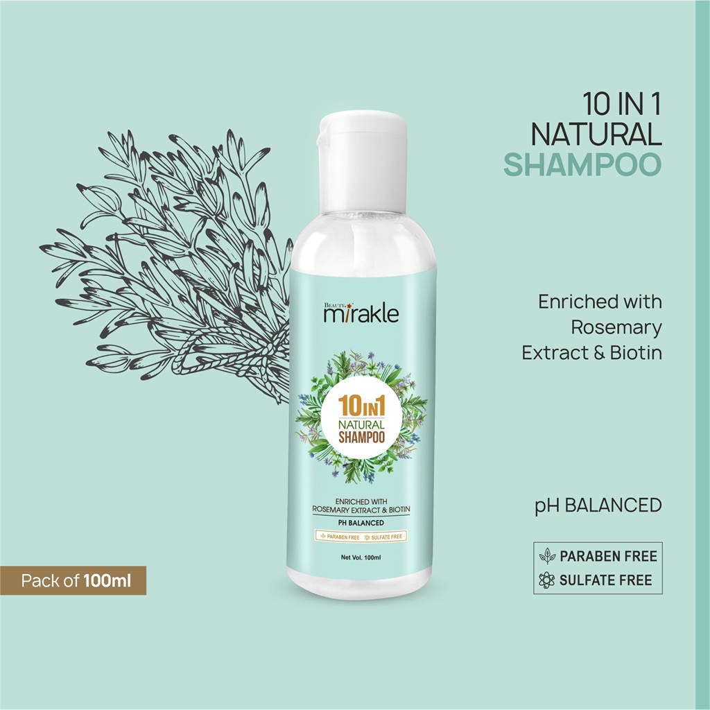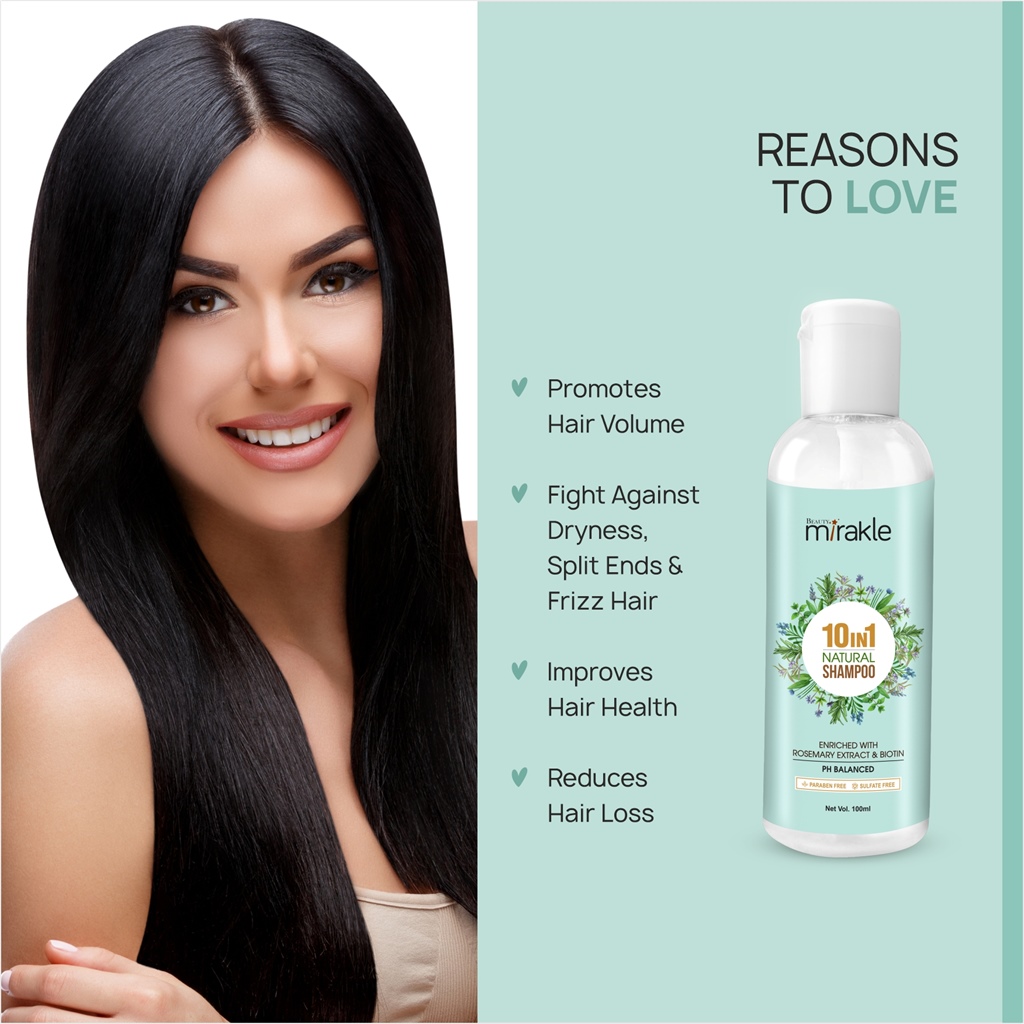 Beauty Mirakle 10 in1 Natural Shampoo is a premium sulphate-free & paraben-free shampoo that delivers 10 hair benefits including adding healthy volume to your hair. Enriched with rosemary extract, biotin and several nourishing bioactives. It fight against dullness, dryness, hair fall, split ends & frizz hair.